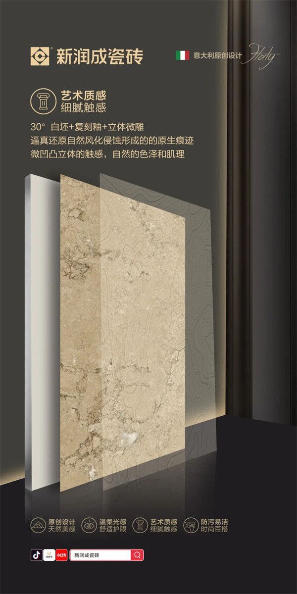 以突破时空的永恒自然之美为灵感,镂刻岁月的纹理,逼真还原自然风化侵蚀形成的的原生痕迹,打造微凹凸立体的触感,肌肤釉面质感,手感细腻顺滑,重塑石材自然之美。