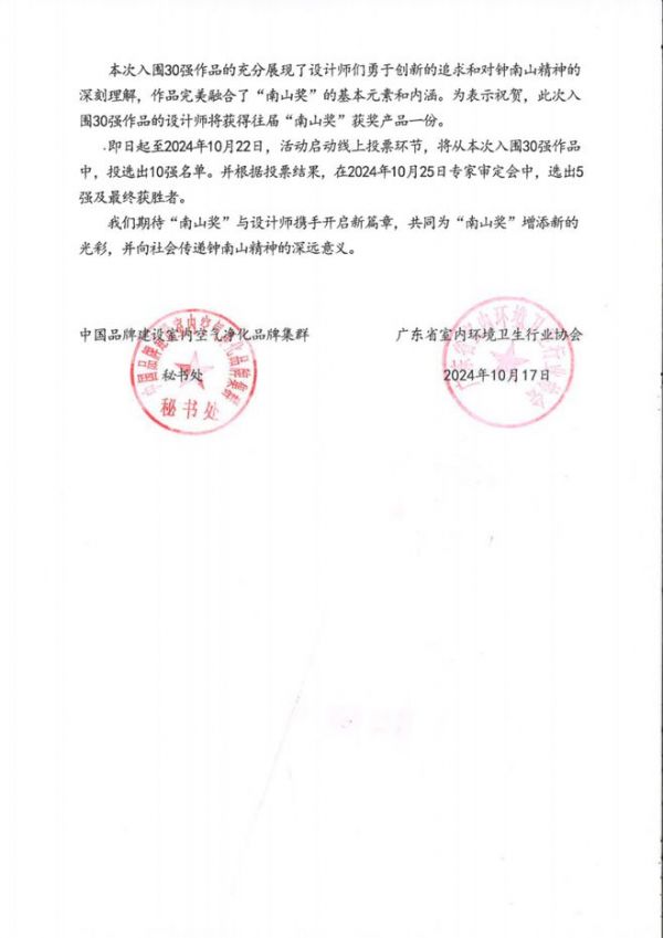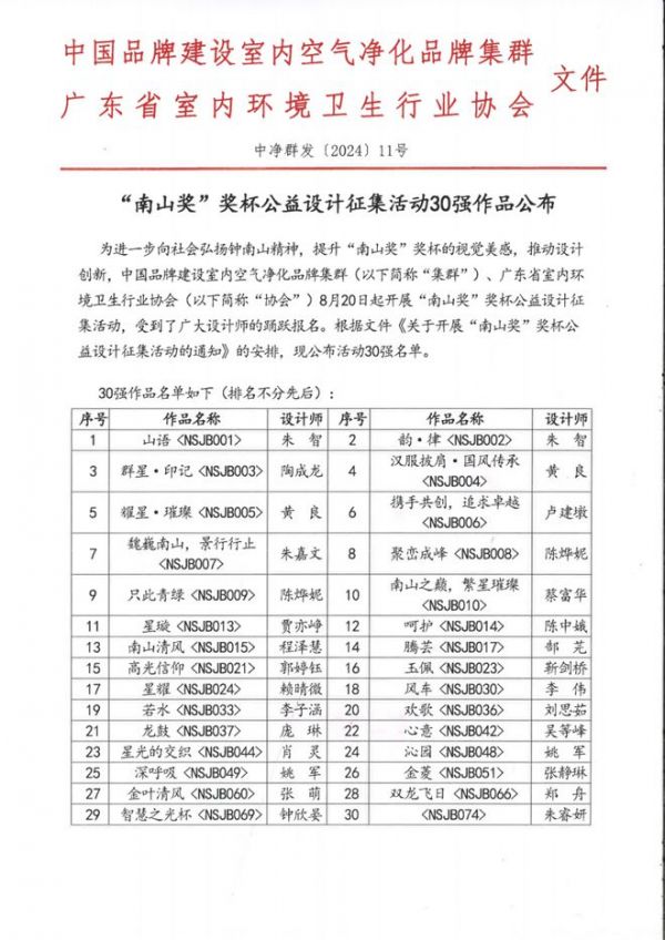 由中国品牌建设室内空气净化品牌集群、广东省室内环境卫生行业协会、网易家居联合主办,国家空气净化产品检验检测中、广东省工业设计协会、广州美术学院工业设计学院、高端品牌实验室共同协办的“南山奖”奖杯公益设计征集活动,自8月20日启动以来得到了广大设计师朋友的高度关注和踊跃报名。根据《关于开展“南山奖”奖杯公益设计征集活动的通知》,10月17日公布活动30强名单,并开启投票通道!