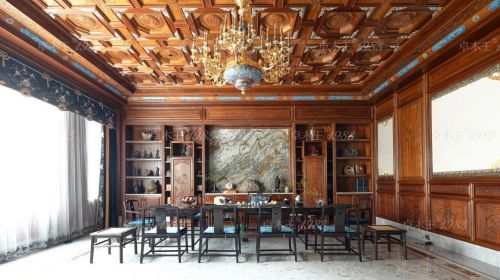 由卓木王红木整装落地的宁波红木整装传世大宅的茶室,以古典中式元素为主,采用缅甸柚木木作,家具选用卓木王《中国梦富春山居和谐茶台》系列产品,名贵的大红酸枝老料制成。既保留了东方美学精髓,又更符合当代人的审美需求。