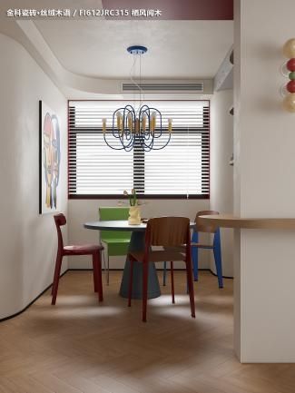 • 色彩游戏:暖棕色的木纹砖是理想的背景板,巧妙中和了客厅的红色单椅、餐厅的蓝绿餐椅和大胆的彩色抽象画。这种装修风格,既有原木风的基底,又让彩色家具成为视觉焦点,艺术感十足。
