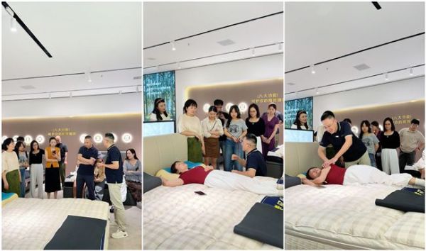 在床垫体验区,负责人对产品内外材质、结构、功能进行了详细解说。阿密达床垫采用独立袋装弹簧系统,经无纺布独立封装后精密排列,实现“单弹簧受力互不干扰”的静音效果;面料则选用天然植物纤维与高克重功能面料,产品通过SGS检测认证,其耐用性强,床垫内部结构公司提供30年质保服务。针对环保需求,负责人特别提出目前床垫采用纯手工的制作工艺,甄选全球供应商,0胶水,无甲醛,各产品均优于国家执行标准。