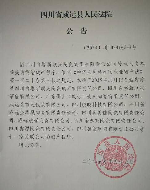 10月13日,“西南陶瓷王”白塔陶瓷及其10家关联公司破产程序终结,为长达518天的清算画上句号。这家曾拥10余条生产线的区域龙头,破产前资产仅1.58亿元,负债却达6.24亿元,资产负债率394.79%,核心资产全被抵押,无财产可供执行。