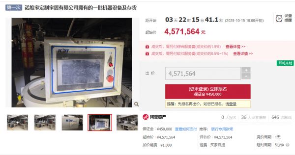 2025年10月15日,广东省清远市诺维家定制家居有限公司的全套工厂生产线及相关设备将在网络司法拍卖平台公开拍卖,起拍价457万元。截至发稿,这场拍卖虽已吸引646次围观,但仍无人报名参拍。