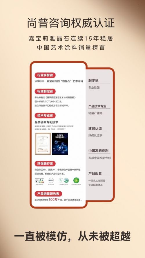 嘉宝莉的成功,离不开其对技术研发的持续投入和对品质革新的不懈追求。2009年,嘉宝莉始创“雅晶石”艺术涂料。起步早,专业强,牵头并制定《建筑用厚涂型艺术涂料雅晶石》团体标准T/SDTL09-2022,建立行业技术门槛成为专业领域标杆。拥有14项艺术涂料相关发明专利的技术底蕴,为雅晶石的卓越品质提供了坚实保障。六大权威环保认证,以硬核实力打破“进口即高端”的迷思。