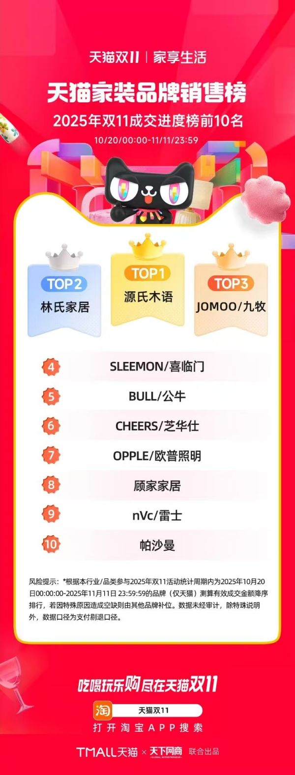 今年双十一,实木家居品牌源氏木语再度交出优异答卷:不仅强势蝉联天猫家装品牌销售榜TOP1,实现全域高速增长,更通过携手天猫双11“疯狂好六夜”超级IP,作为其超级品牌联盟,将“实木”这一传统品类,以生动有趣的姿态成功植入新一代消费者的生活愿景,完成了从“销售爆发”到“品牌深化”的价值跃升。