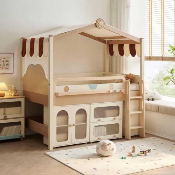 儿童房半高床,屋顶造型带来满满安全感,爬梯设计更添童趣。生态科技皮软包床头,触感亲肤舒适,日常打理更轻松。贴心加高护栏设计,防止意外掉落,父母更加安心。床底可打造宝贝专属小天地,也可搭配储物柜,实现封闭式分类收纳,从小培养孩子的整理习惯。