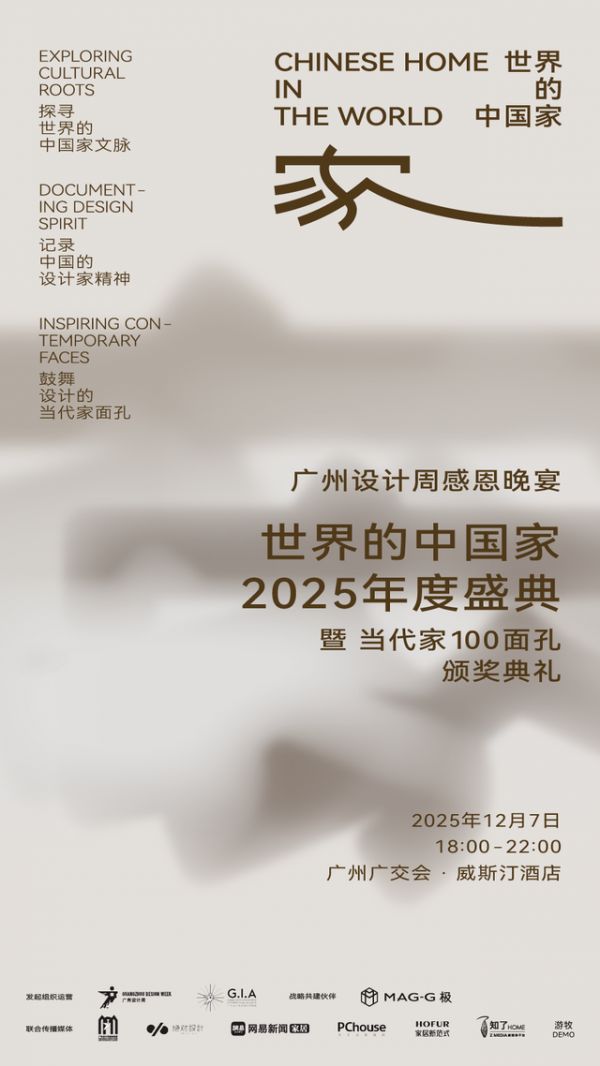 12月7日晚,「世界的中国家」将在广州设计周感恩家宴上举行年度颁奖环节,100位「当代家设计100面孔(2025-2026)」将于现场正式亮相并接受表彰。他们以独立的设计思考和实践,呈现出当代中国居住文化的多样表达。活动现场还将发布「世界的中国家」主题宣传片,以影像方式介绍项目的概念,记录属于这个时代的“家”文化观察与思考。