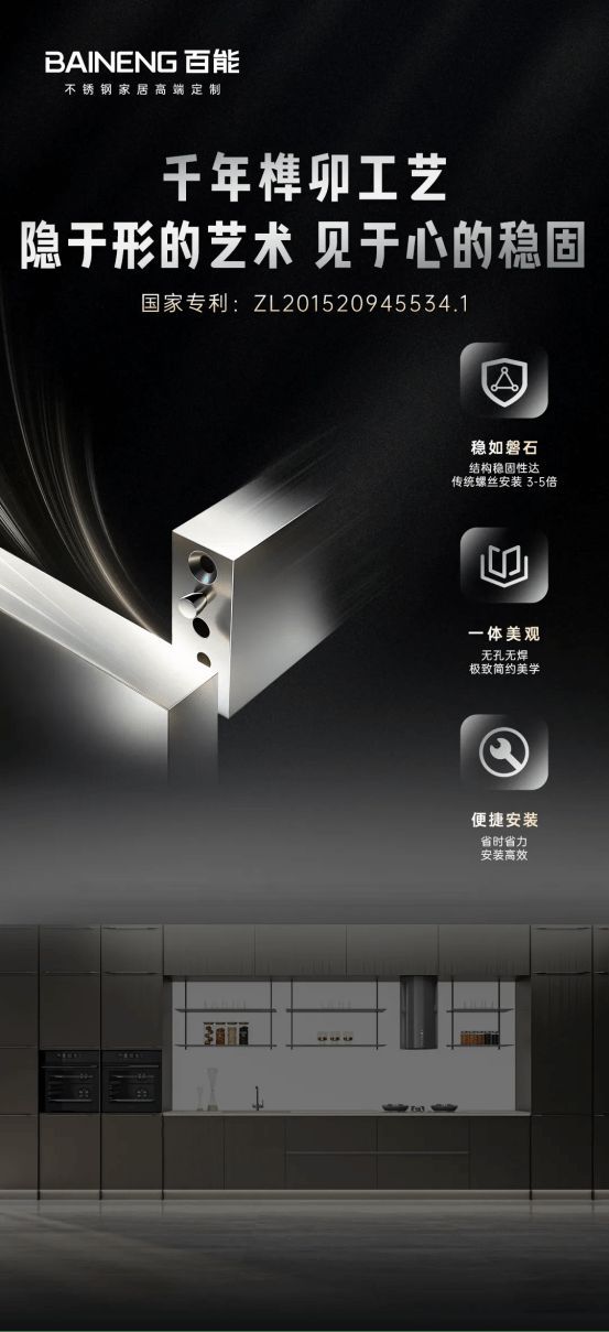 百能大胆创新,将传承千年的榫卯智慧与现代不锈钢工艺完美结合,独家研发出不锈钢榫卯走马销拼装工艺,并获得国家专利。无需一颗钉子,仅凭榫卯之间精密的咬合,便实现了柜体的无缝衔接与极致稳固,其结构稳固性达传统螺丝安装的3-5倍。