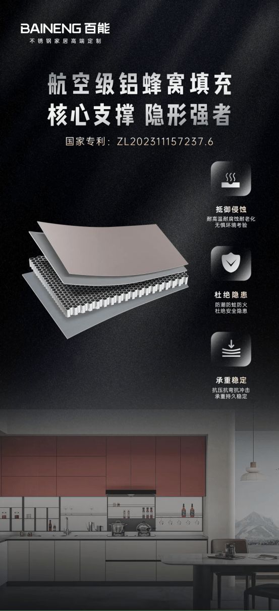 从食品级基材的选择,到榫卯结构的创新,从铝蜂窝内核的填充,到静电微喷与抗菌表面的处理,每一项核心工艺的背后,都凝聚着百能的研发智慧,159+项国家专利技术,不仅是百能硬核实力的体现,更推动着不锈钢家居行业不断向前发展。
