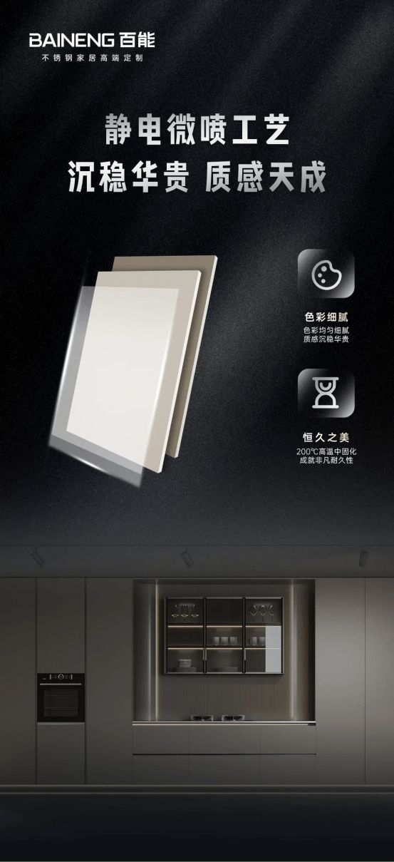 百能自主研发静电微喷工艺,粉末涂料在200℃高温下固化,形成一层均匀细腻、质感沉稳华贵的表面。不仅赋予了不锈钢更多色彩与质感,更成就了产品非凡的耐久性,确保色彩恒久如新,历久不衰。