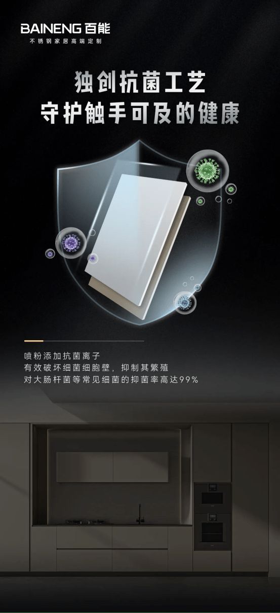 健康家居,始于选材。百能率先将食品级304不锈钢引入家居领域,并拥有国家专利认证。作为柜体的核心基材,304不锈钢天生具备优异的防潮、防水、抗菌特性,能够从根源上杜绝霉变隐患。