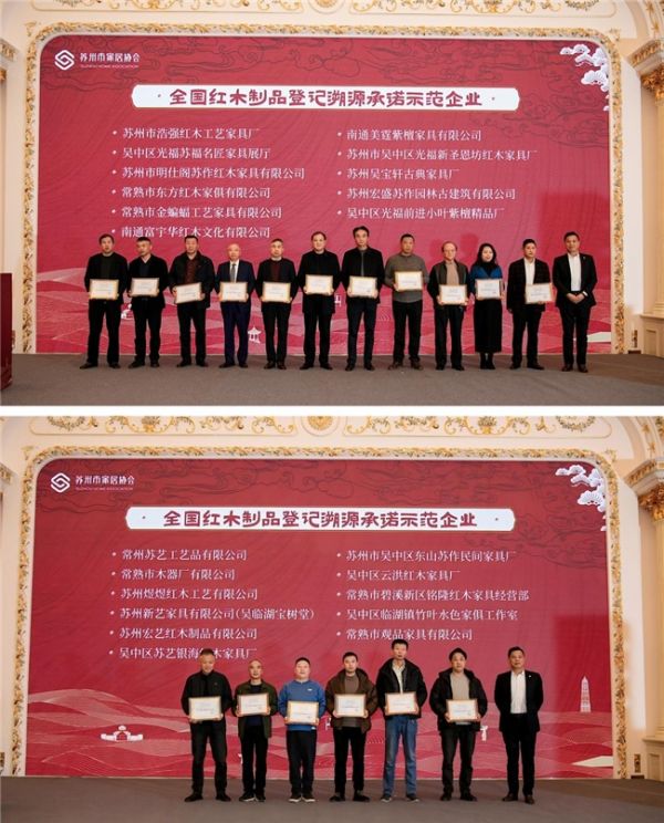 由国家林草局发改司批准成立的全国红木制品数字化登记及质量溯源工程,通过“四报告、一码、一标识、一证书”的全链条溯源体系,为产业诚信生态建设提供技术支撑。首批全国红木制品登记溯源承诺示范单位授牌仪式同期举行,来自苏州、常熟、南通、常州等地的优秀企业获颁荣誉,为行业标准化、溯源化发展树立标杆。