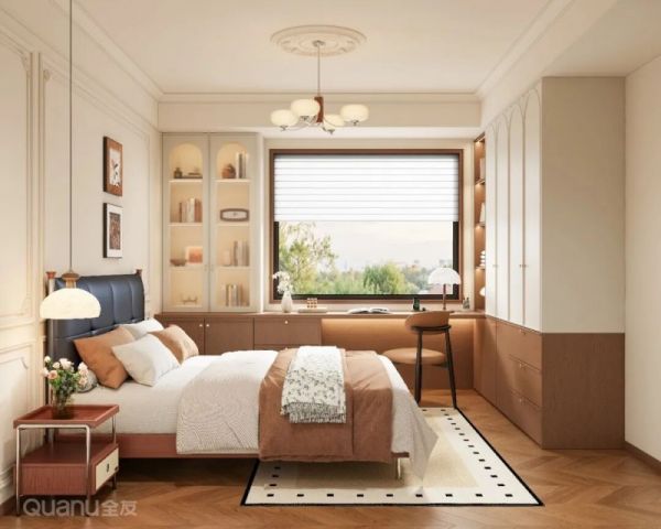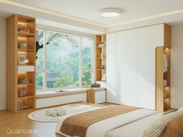 对于带飘窗的卧室,可利用飘窗定制书桌,转角与衣柜自然衔接,既利用了天然采光,又实现了衣物收纳与高效办公。