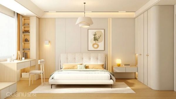 若卧室面积有限,可沿侧墙定制通顶衣柜,在转角处衔接悬浮抽屉作为梳妆区。既保持空间连贯性,又巧妙利用闲置角落。