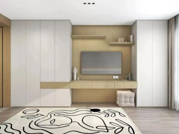 若卧室中需要放置电视,不妨采用衣柜+电视柜的一体式布局。电视柜采用悬浮台面设计,搭配抽屉收纳常用物品,左右两侧与通顶衣柜自然衔接,视觉上形成空间延伸感。