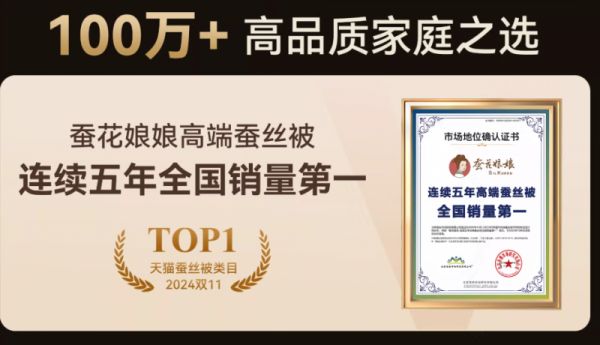 据第三方权威机构发布的《2020–2025年中国高端蚕丝被市场调研分析报告》显示,在2020年10月至2025年9月的统计周期内,蚕花娘娘在“填充物为100%双宫茧桑蚕长丝、符合国标优等品且获高档丝绸标志认证”的严苛筛选标准下,实现了高端蚕丝被全国销量的连续五年领先(证书编号:WDMR-2025SV-010271)。这一市场表现,折射出消费者对高品质、可溯源蚕丝产品的持续信赖。