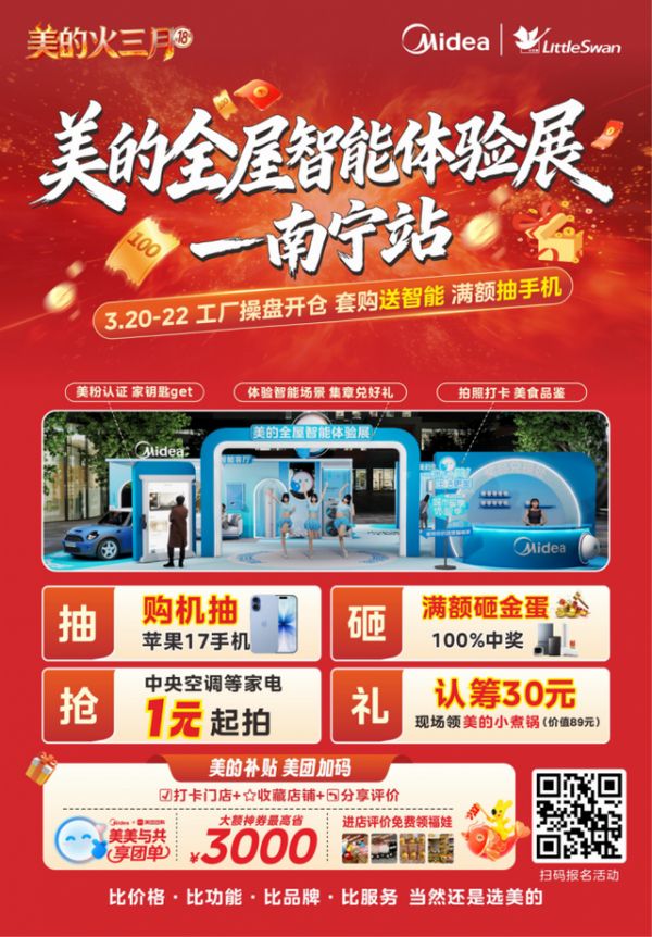 认筹方式:即日起,可前往南宁任一美的门店参与30元认筹,或扫描下方二维码线上报名,还可以直接前往南宁江南万达广场1号门前参与活动。