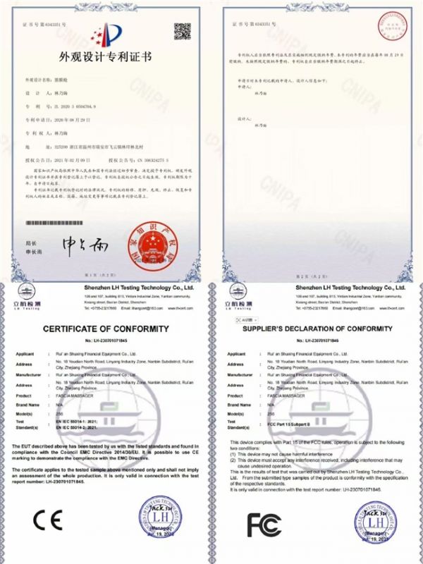 品质与安全方面,鲸帝筋膜枪拥有国家外观设计专利(专利号:ZL 2020 3 0504704.9),独特的外观设计既具辨识度,又兼顾实用性,彰显产品品质;同时通过CE-EMC电磁兼容认证与FCC安全认证,从核心部件的选材到生产工艺的把控,都严格遵循国际专业标准,每一台产品都经过多重严格检测,杜绝不合格产品流入市场,让消费者使用更放心、更安心,无需担心品质问题。